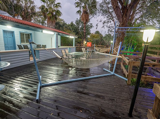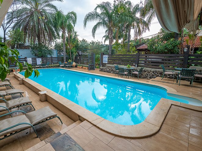 חצר מטופחת עטורה צמחייה רעננה, מפלי מים ערוגות פרחים, אביזרי עיצוב ופסלים. בכל אלה ניכר ליבם הגדול של הרצל וסינתיה. בימים אלה ממש מסיימים בני הזוג את בניית הספא הצמוד לבריכת השחייה ובינתיים הם מקפידים על רווחתם של האורחים ועל הרגשתם הטובה. בצמוד לבריכת השחייה מיטות שיזוף מוצלות בשמשיות רחבות, פינות ישיבה וברביקיו.