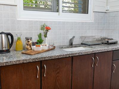 במטבחון - מקרר, פינת קפה, כיריים ומיקרוגל, סכו"ם, צלחות . יש להביא מהבית כלי בישול (סיר/מחבת)