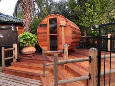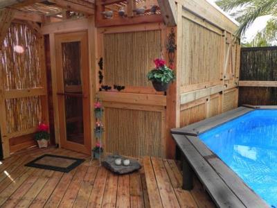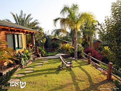 בחצר כל בקתה מדשאה, כסאות נח לישיבת בטלה מול השמש הכיפית, בריכת דגי נוי וברקע ציוץ ציפורים.