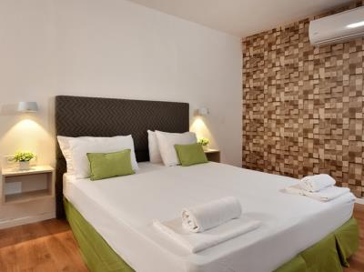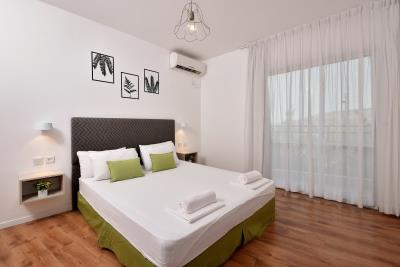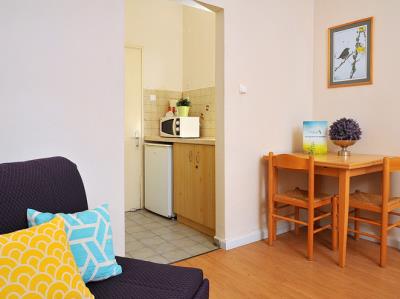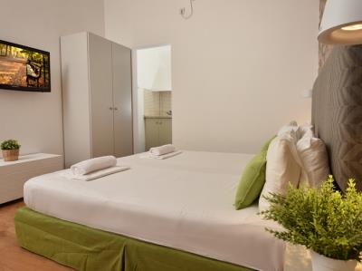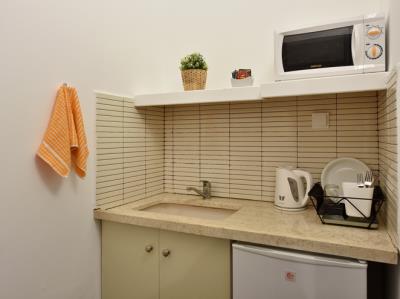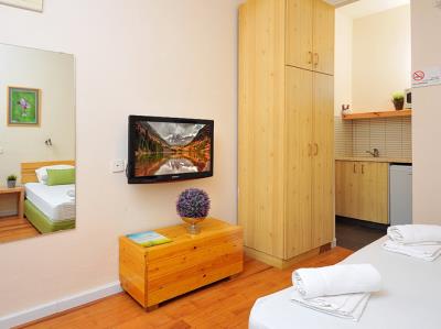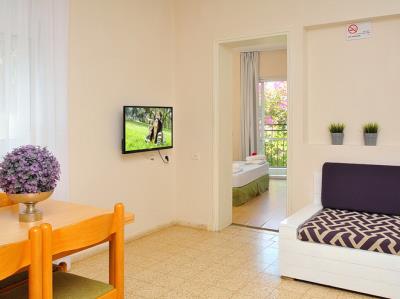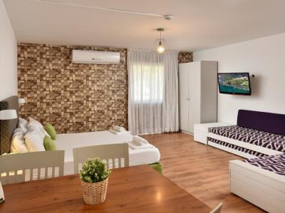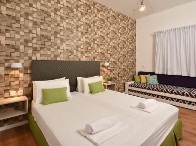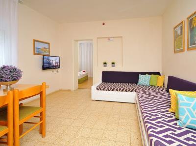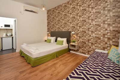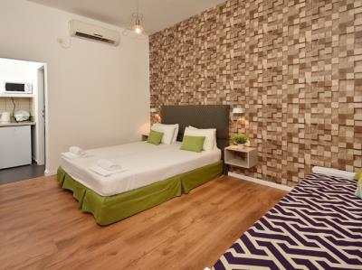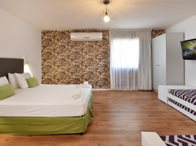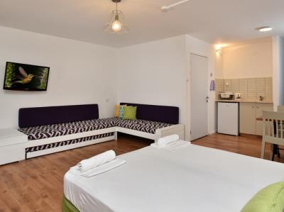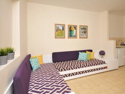 * חדרי סטודיו למשפחות המחוברים ביניהם במבואה רחבת ידיים עם פינות ישיבה.